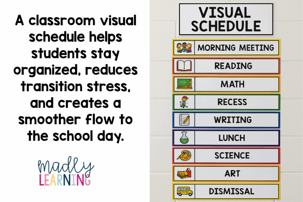 Children thrive on predictability. Posting a visual schedule at the front of the room gives students a sense of what’s coming next. This strategy works especially well for students who get anxious about transitions. You can use a simple whiteboard with magnets or digital slides projected on the board. By eliminating the mystery of “what’s next,” you help students focus on the task at hand and reduce off-task behaviour.